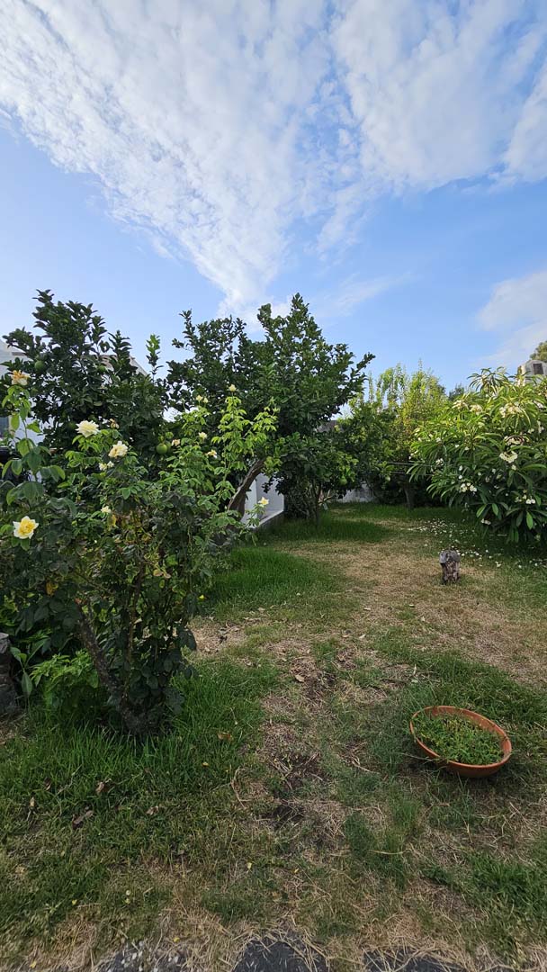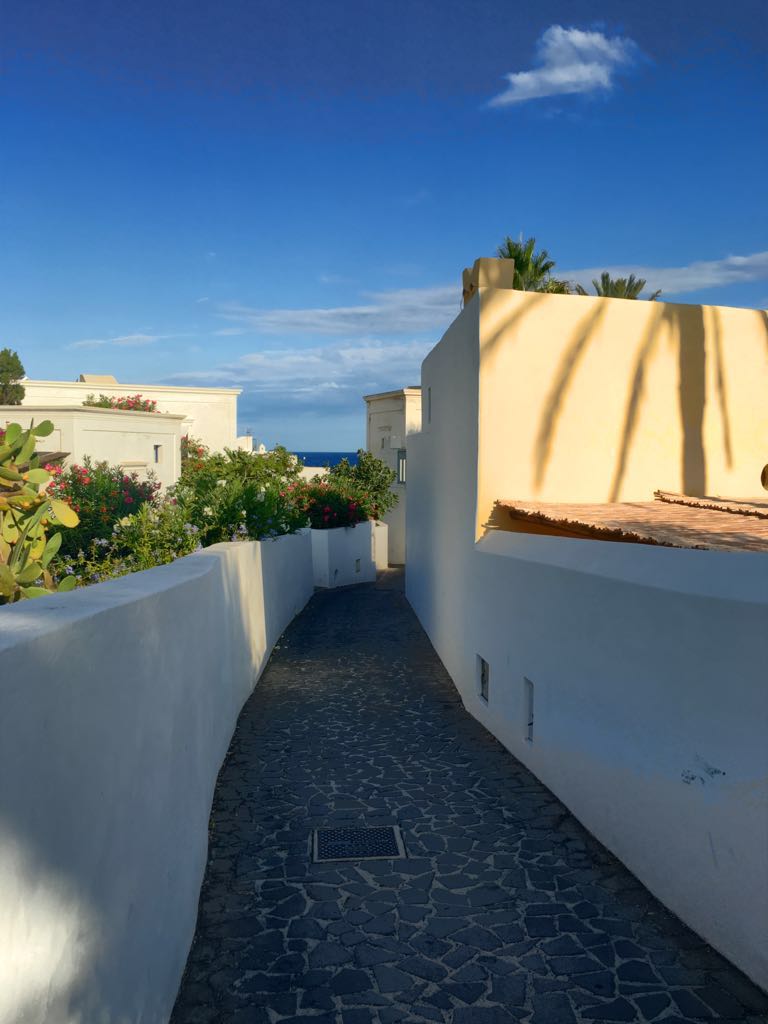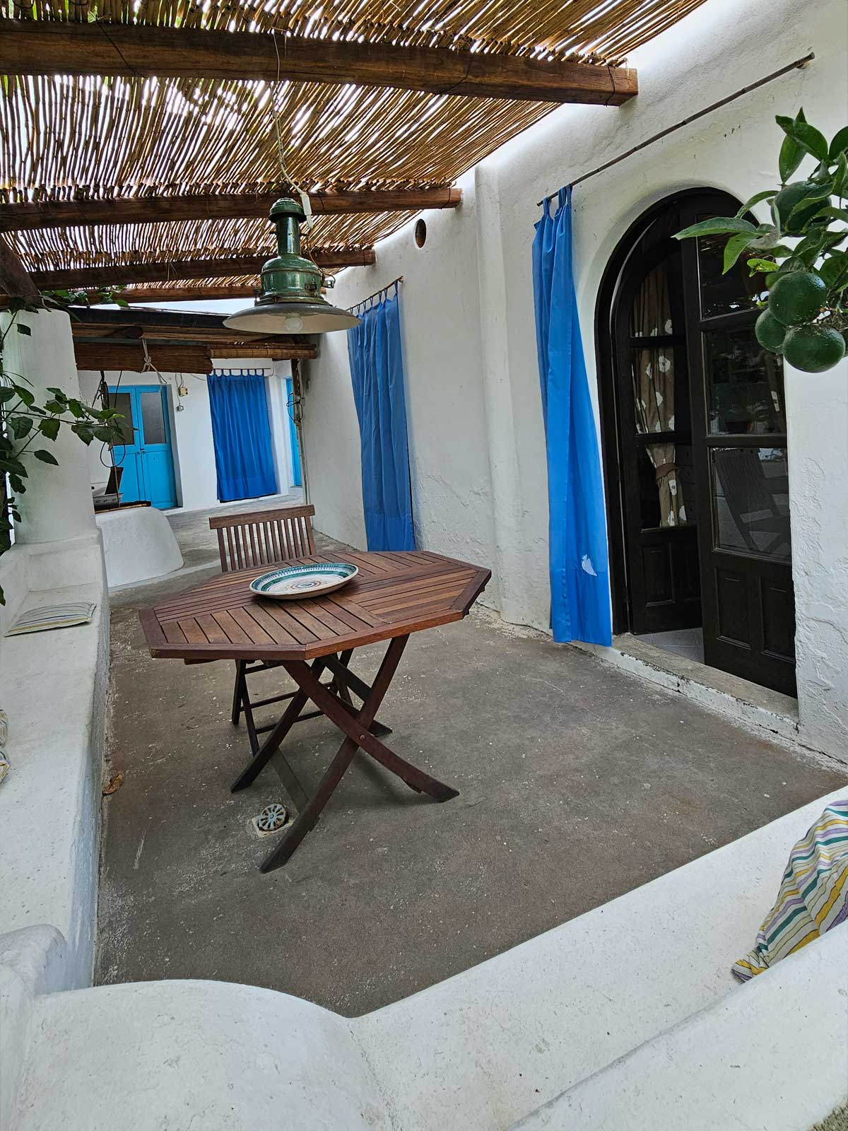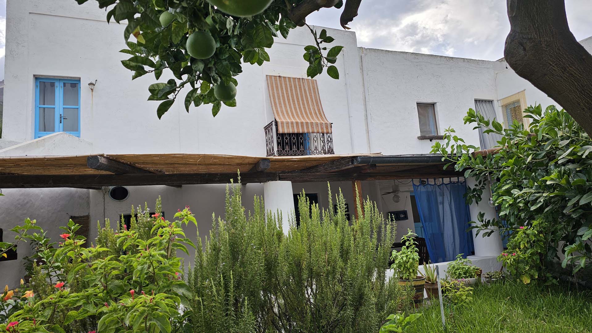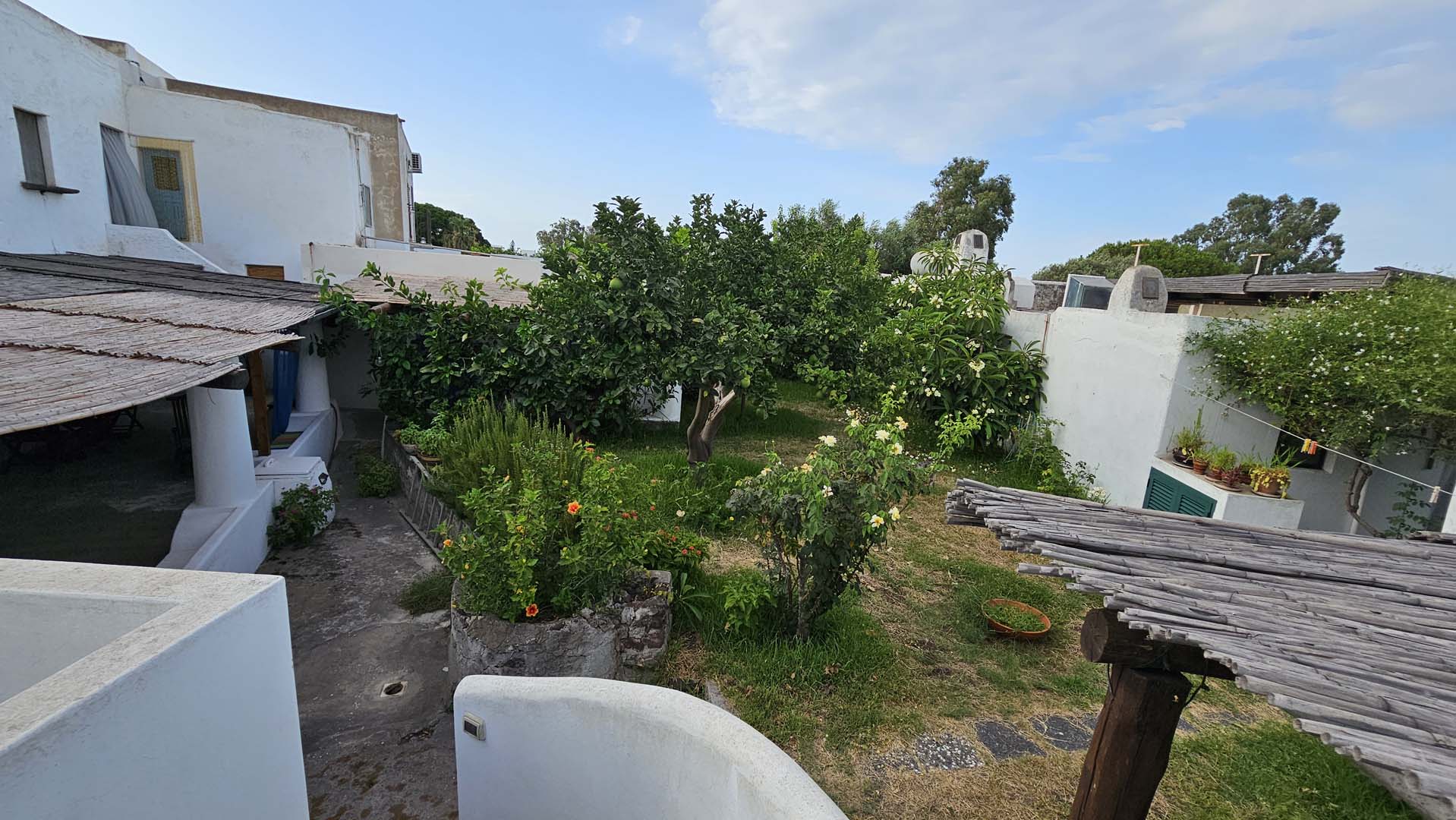 La casa dalle linee e colori tipici eoliani con un rigoglioso giardino interno di fiori e alberi da frutto si trova in località Scari, in via Rinella, a pochi passi dalla spiaggia di sabbia nera. È costruita su due piani suddivisi in quattro appartamenti autonomi (ciascuno con proprio bagno e cucina) collegati da un ampio cortile dove si trovano anche tre capienti cisterne che raccolgono dai tetti l'acqua piovana, preziosa scorta per l'estate.